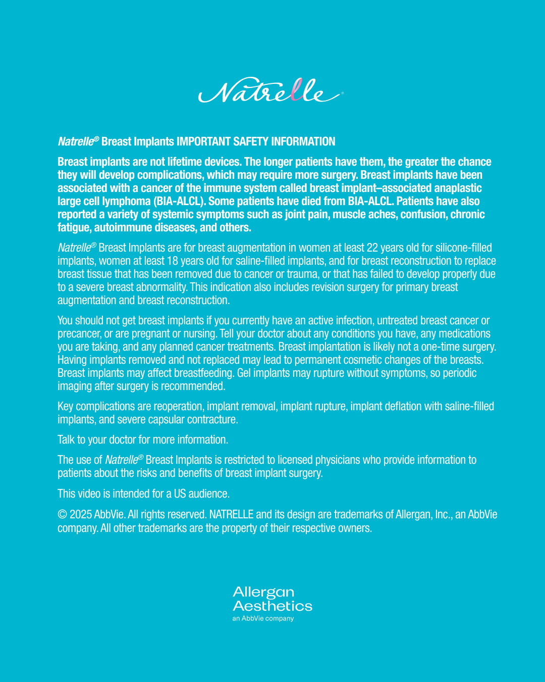 Indications and Important Safety Information including Boxed Warning for BOTOX® Cosmetic (onabotulinumtoxinA) and Natrelle® Breast Implants. Indications and Important Safety Information for CoolSculpting® Treatment, CoolTone® Treatment, DiamondGlow® Treatment, JUVÉDERM® Collection of Fillers, KYBELLA® (deoxycholic acid) injection 10 mg/mL, LATISSE® (bimatoprost ophthalmic solution) 0.03%, REVOLVE™ Advanced Adipose System, and SKINVIVE by JUVÉDERM®.